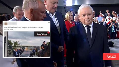 W niedzielę 3 września prezes Prawa i Sprawiedliwości Jarosław Kaczyński spotkał się z mieszkańcami Kielc. Bo stamtąd, a nie z Warszawy, będzie się ubiegał o mandat posła w wyborach parlamentarnych. Jest w Kielcach jedynką. Po zakończeniu spotkania z wyborcami użytkownicy Twittera rozpowszechniali film z komentarzem bądź sugestią, że pokazuje, jak prezesa PiS żegnano w Kielcach. Nagranie trwa dwie i pół minuty. Widać, jak Kaczyński otoczony współpracownikami bądź ochroniarzami wychodzi z jakiegoś budynku, po czym wsiada do jednego z kilku stojących aut. Niedaleko - jak można mniemać - stoją protestujący ludzie, bo słychać gwizdy i powtarzający się okrzyk "wypie*****j!". Funkcjonariusze policji, niektórzy na koniach, oddzielają tłum od samochodu z Kaczyńskim i innych wyjeżdżających aut. W miarę jak kamera śledzi jadące samochody, widać coraz większe grupki ludzi. Protestujący wciąż krzyczą "wypie*****j!", robią zdjęcia, gestykulują - ktoś pokazuje palce ułożone w literę V, ktoś inny obraźliwy gest w stronę przejeżdżających. Policjanci torują drogę do przejazdu aut.